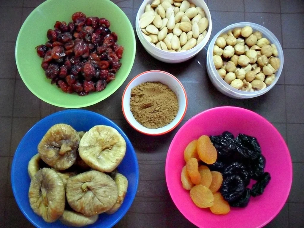 Ispeći i oljuštiti lješnik. Badem blanširati, oljuštiti i blago propeći u rerni. Ohlađeni lješnik i badem po želji krupnije isjeckati (ja nisam). Suhvo voće (smokve, šljive, kajsije) isjeći na krupnije dijelove. Čokoladu isjeckati (ili izlomiti) na komadiće (ja sam imala čokoladne kapljice)